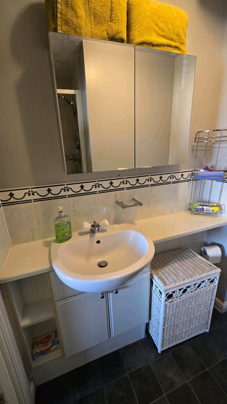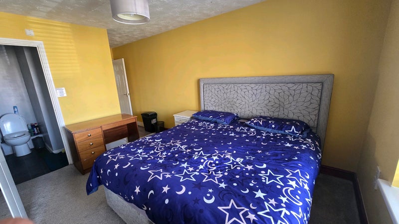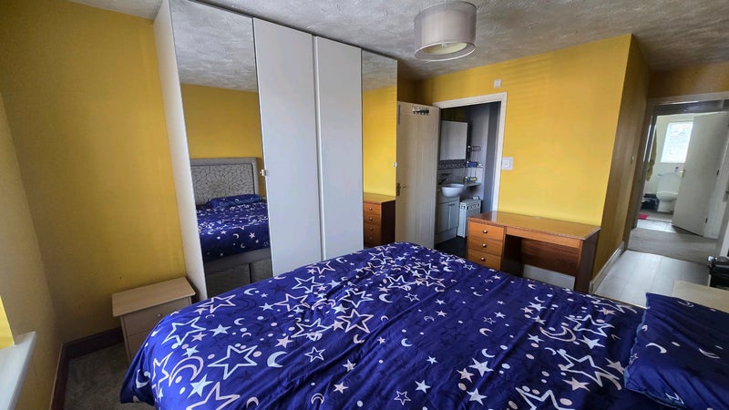 Bright, spacious double bedroom with private ensuite bathroom. This well-presented room is ideal for professional occupancy and features a large double bed with fitted mattress, built-in mirror wardrobes offering good storage, and a private ensuite with shower enclosure, sink, and WC. Room has windows with shutters for privacy and light control, fresh and clean carpet flooring, and includes a desk and 2 bedside cabinets for personal items.