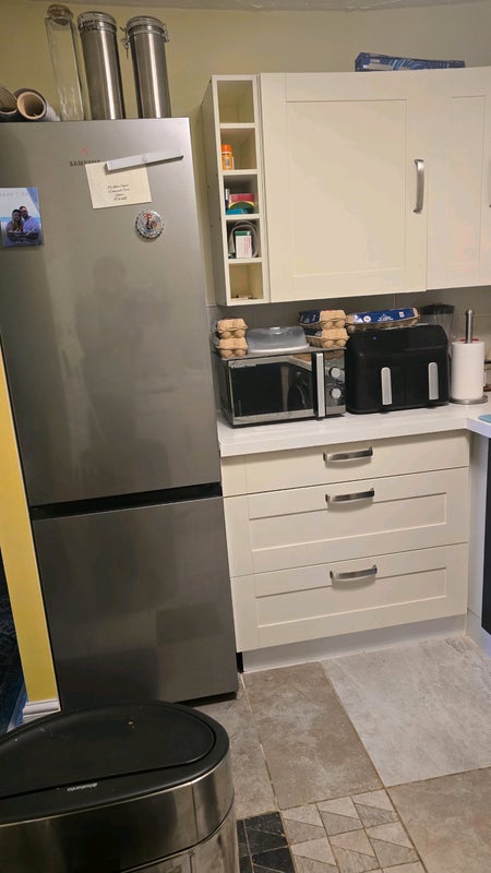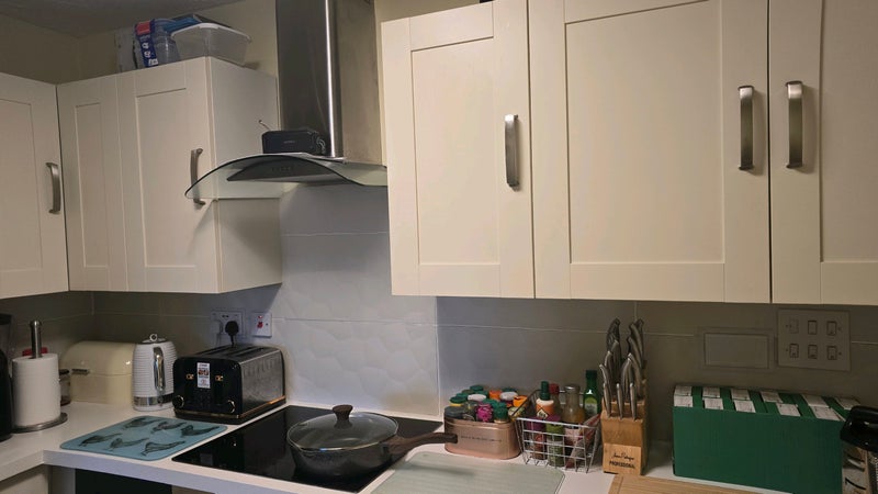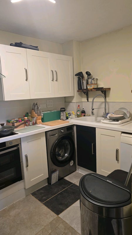 The kitchen is fully equipped with microwave, kettle, fridge, washing machines, oven and hob and fully stocked with pans, plates and cutlery etc. Living room is a work-in-progress as I just moved in.