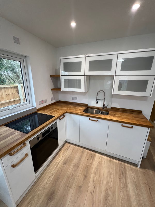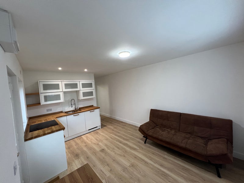 furnished one-bedroom flat with an open-plan kitchen and lounge area. The kitchen includes a washing machine and half-integrated fridge freezer.