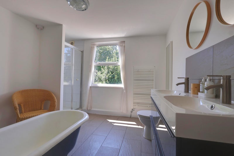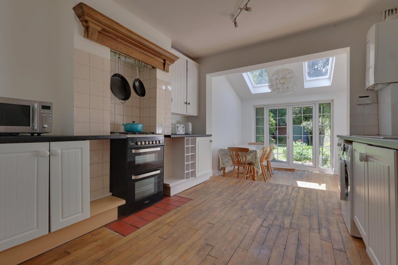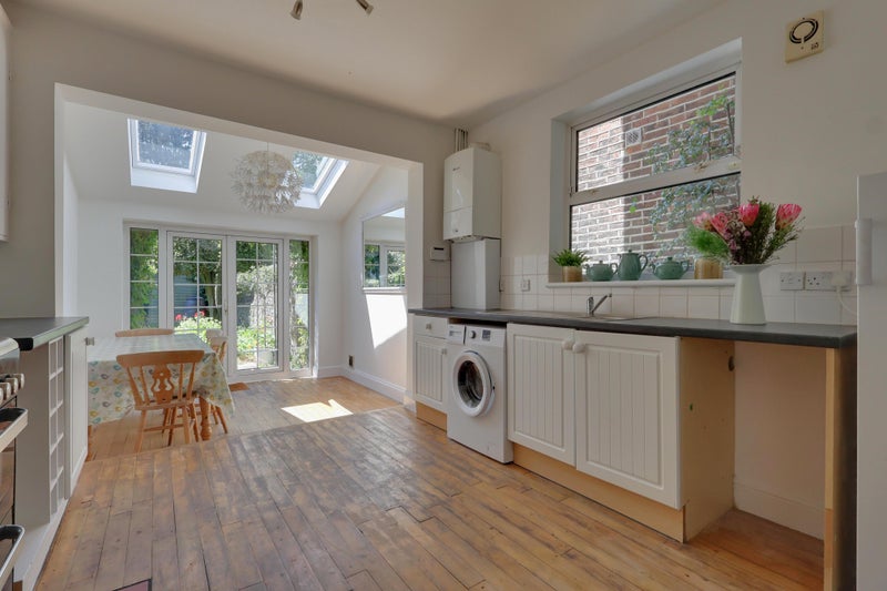 Town center is a two minute walk away, train and bus stations are a five minute walk. Tesco, Aldi and Waitrose all conveniently close for walking. The street has on-road parking for free.