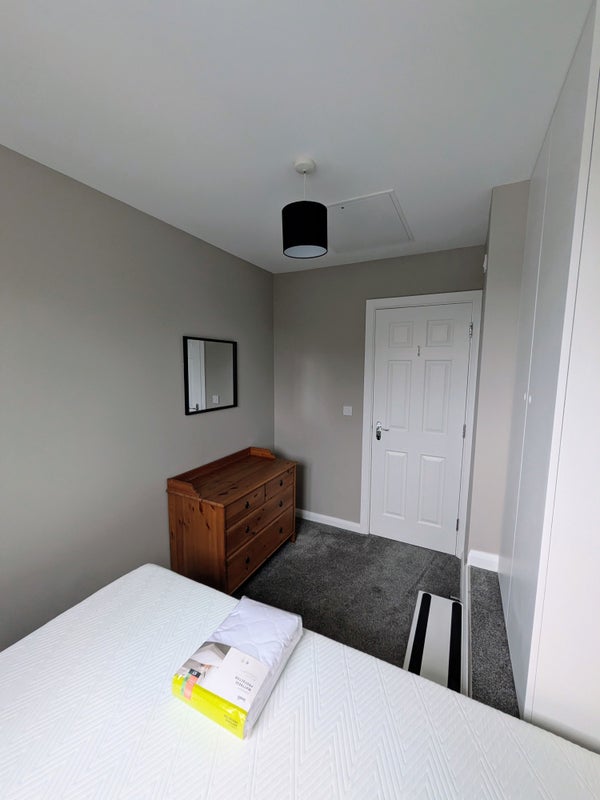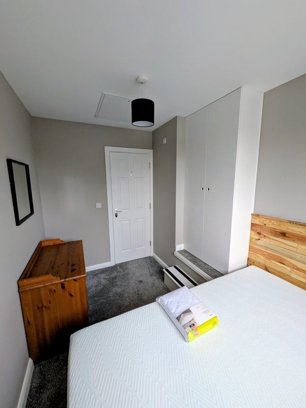 Furnished with a small double bed (120 x 190cm) with brand new memory foam mattress. Good size fitted wardrobe and separate chest of drawers for lots of storage. Wall mounted TV.