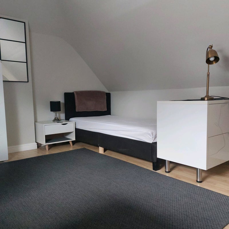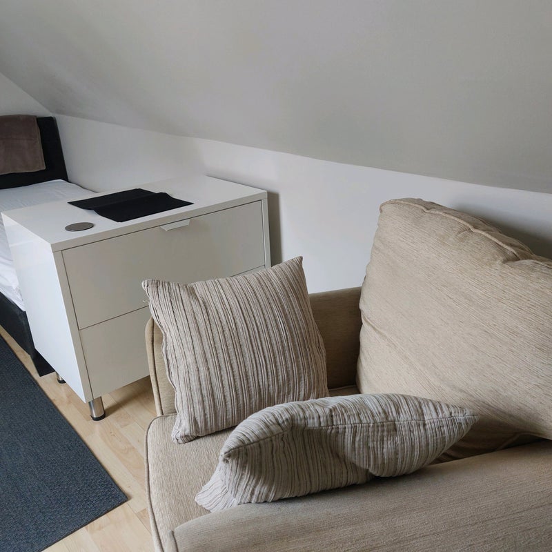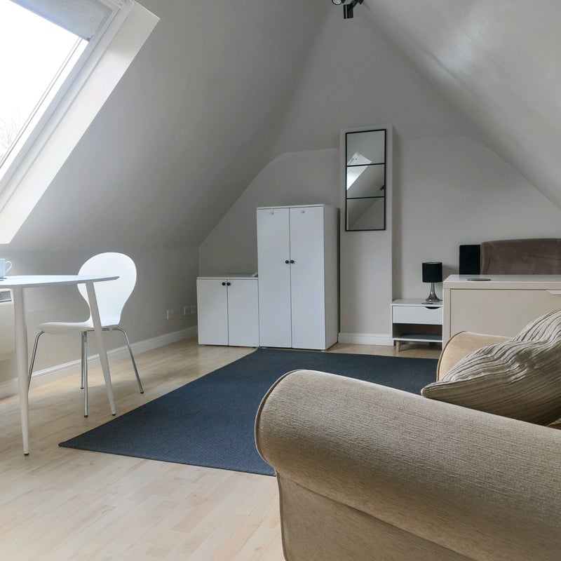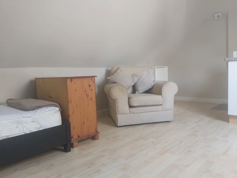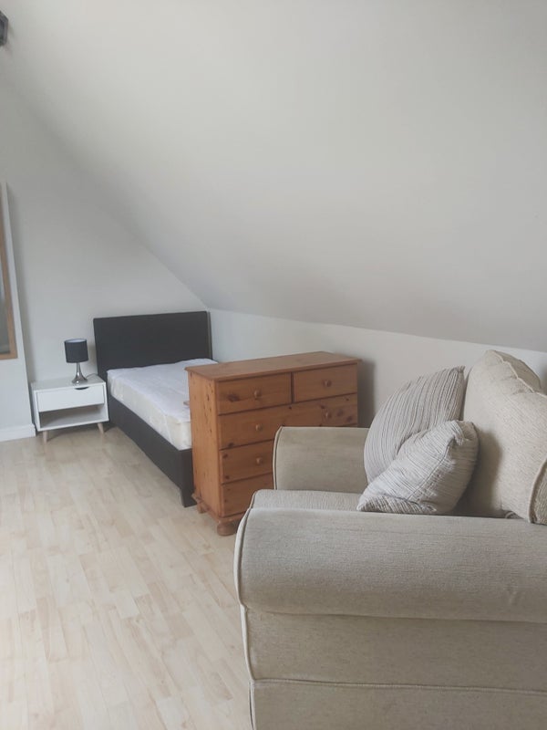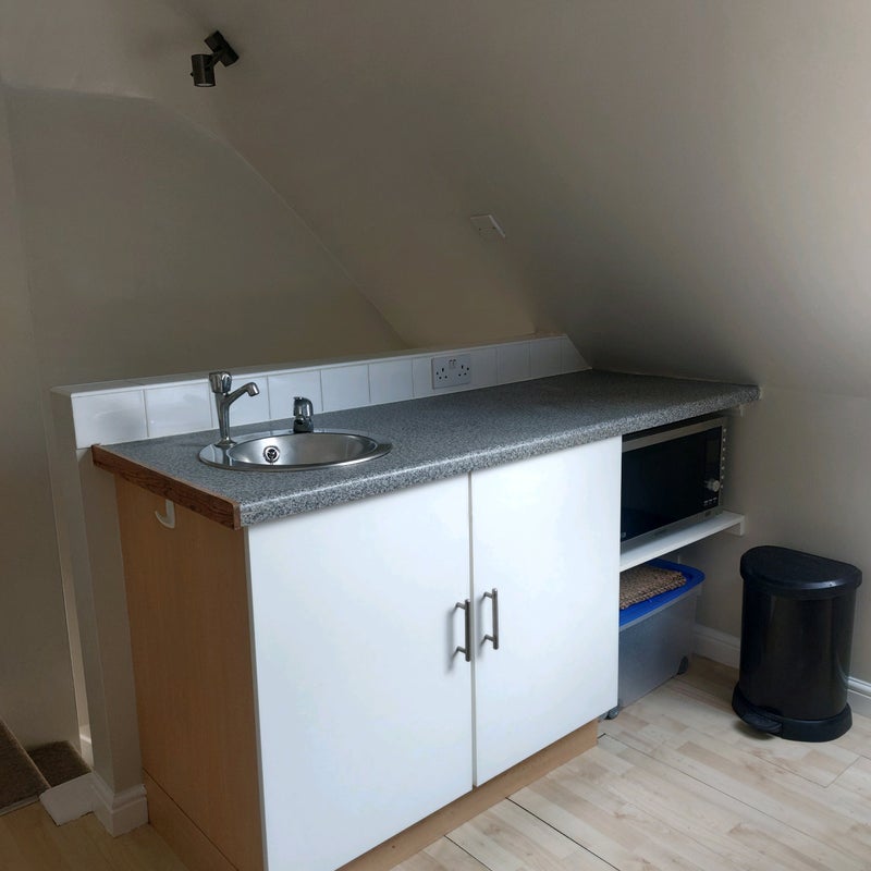 Self contained, spacious and light, 1st floor single bedsit, with own shower/wc. We live in the main house, the annex is self contained and you would be the sole occupant with no shared facilities other than the garden and driveway. (We are friendly!!)