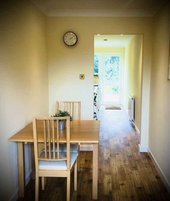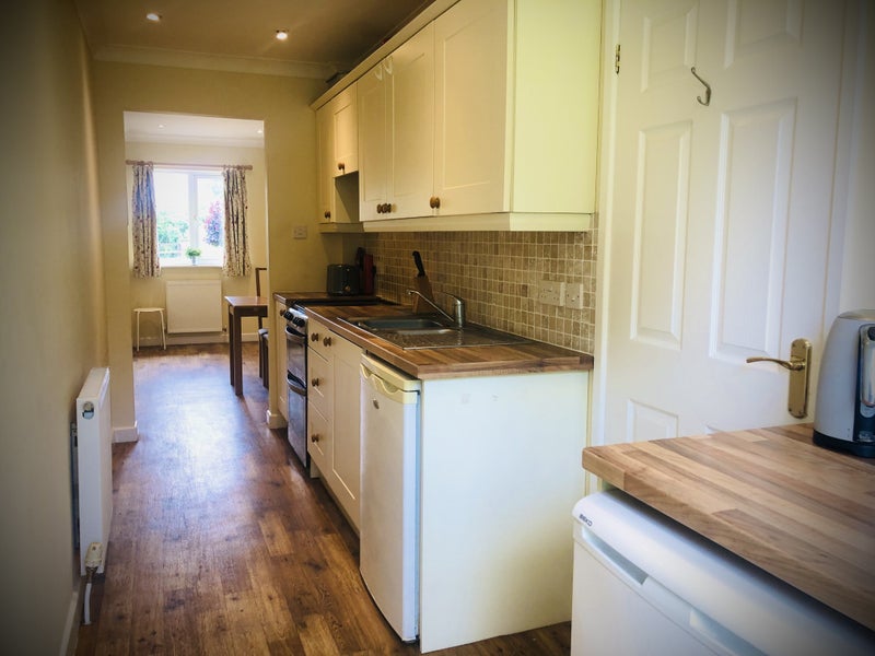 There is a separate entrance, kitchen, and a sitting room/dining room. The en-suite has tea/coffee-making facilities and a mini-fridge. The room is furnished in a contemporary style with beautiful views and overlooks a pretty garden. There is parking on the driveway.