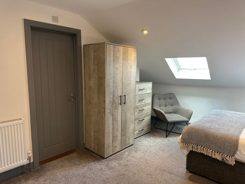 This spacious second-floor loft room features a unique layout with two Velux windows in the roof slope, filling the space with natural light. It comes fully furnished and includes: