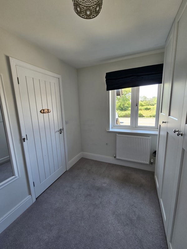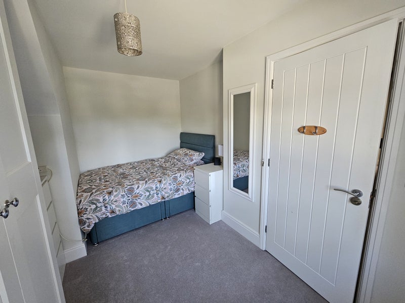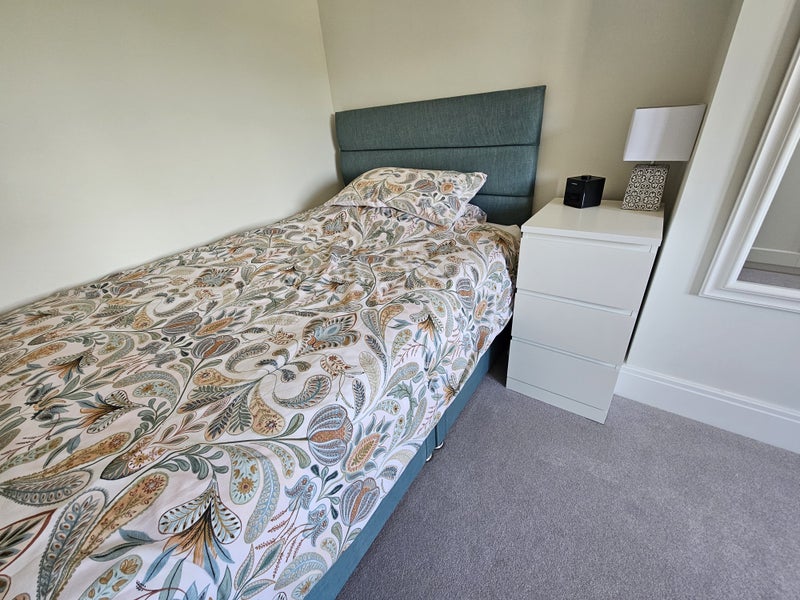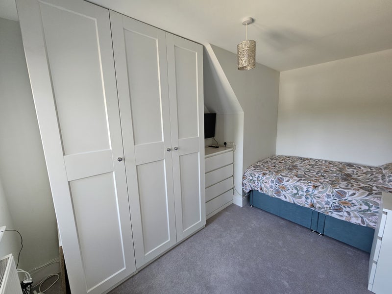 I have furnished the room with a brand new bed, bedside cupboard, four-drawer chest of drawers, 1.5m floor to ceiling wardrobe with variety of hanging and shelving, brand new television on wall bracket, full length mirror and view over the front of the house