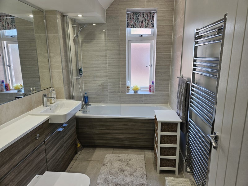 The bathroom has a bath with shower overhead, wash basin and toilet and is almost exclusively for your use, apart from an occasional bath for my twelve-year old granddaughter who comes to stay once a week, and any of my friends and relatives who stay in my guest bedroom