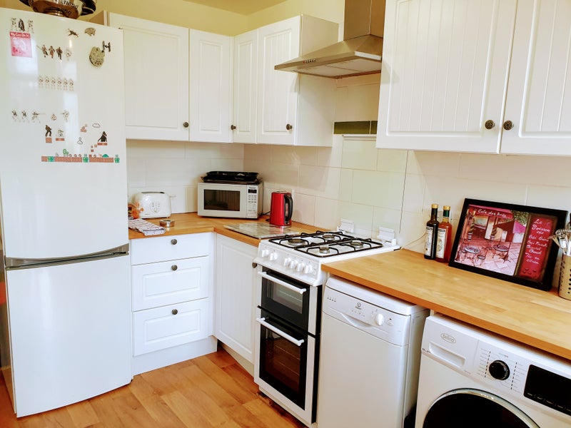 Modern kitchen with new worktops, fridge freezer, microwave, dishwasher, washing machine.