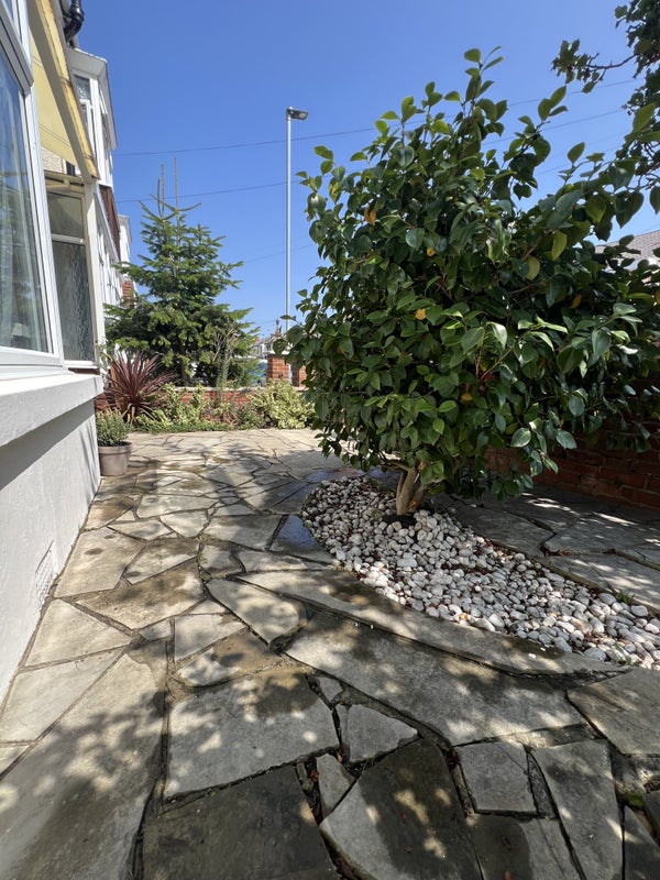 A sunny, west‑facing garden with an apple tree and visiting birds — especially lovely in spring and summer.