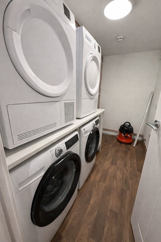 🧺 Utility room with 2 washing machines, 2 tumble dryers & wall-mounted airer