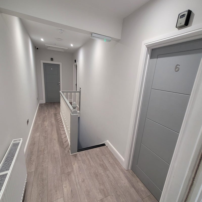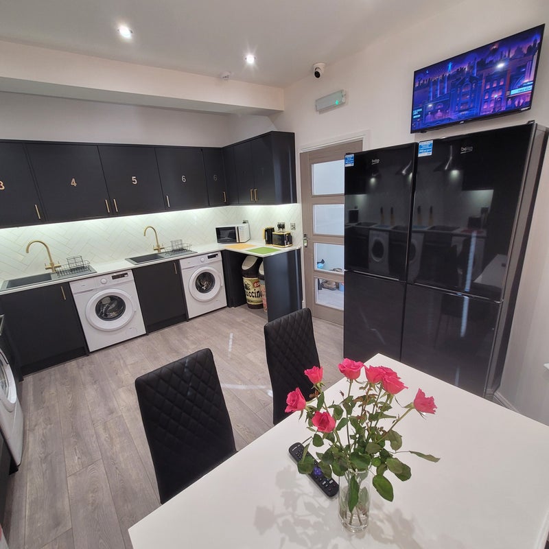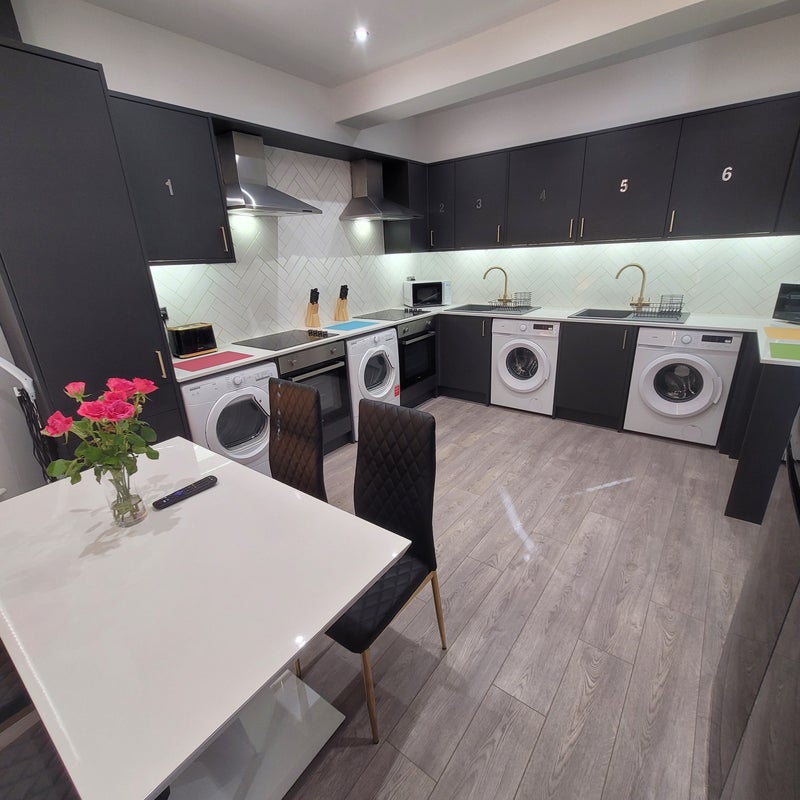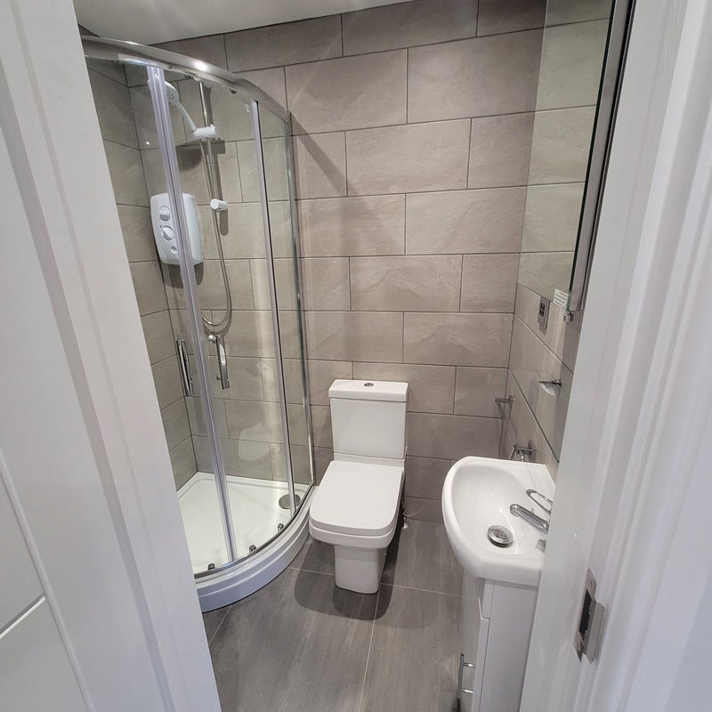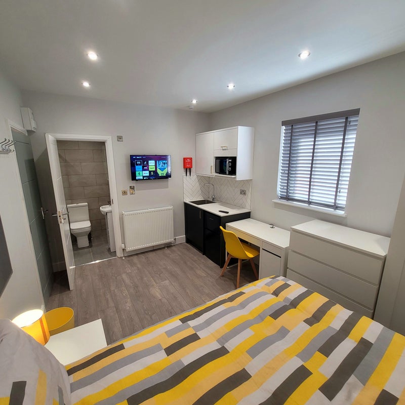 Fully furnished studio apartment designed for comfort, privacy, and convenience. The studio has a double bed, modern kitchenette with quartz worktops, fridge & freezer, microwave oven, and generous worktop and cupboard space. Allocated off-road parking bays for each tenant, CCTV surveillance, and superfast 900MB fibre broadband