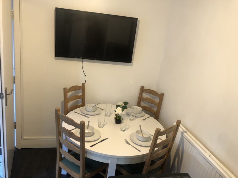 Fully Fitted communal kitchen/dinning area with dining table and chairs. A separate utility area housing a washing machine, tumble dryer and fridge/freezer