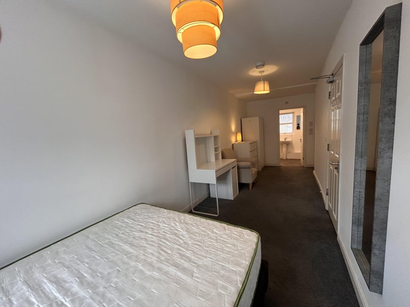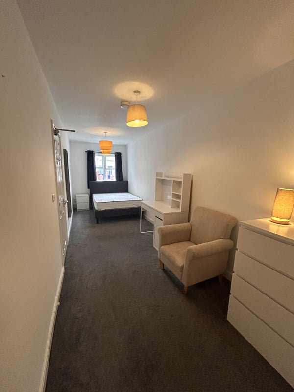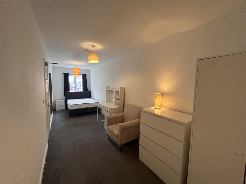 Good sized double room with bay windows that soak the room with natural sunlight. The bedroom comes fully furnished with a double bed, a wardrobe, chest of drawers, side table, and a study table with a chair.