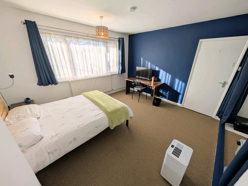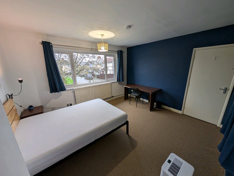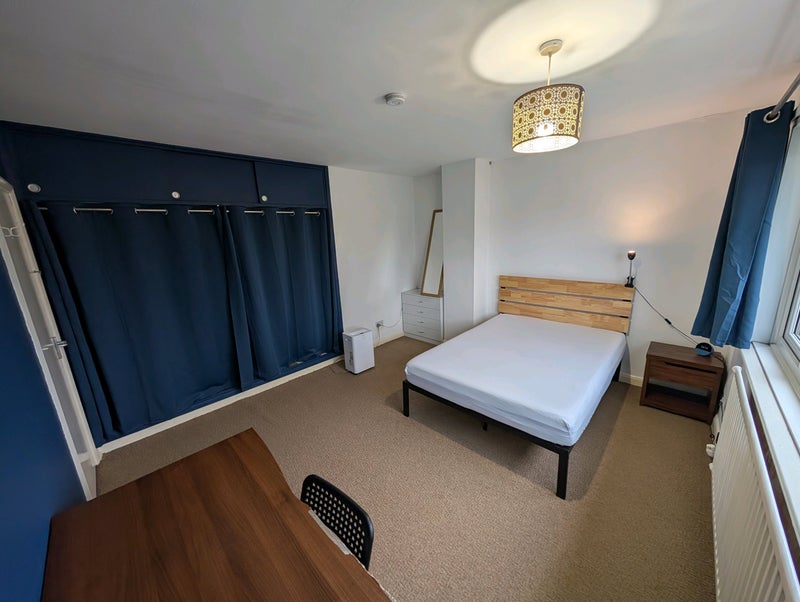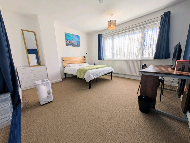 The room comes fully furnished (bed + mattress, chest of draws, built in wardrobe, bedside table, desk, chair and mirror). Kitchen fully furnished with washing machine, dryer, large fridge freezer, microwave, toaster, kettle, 7 in 1 ninja cooker, slow cooker ect...
