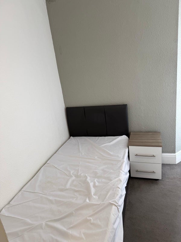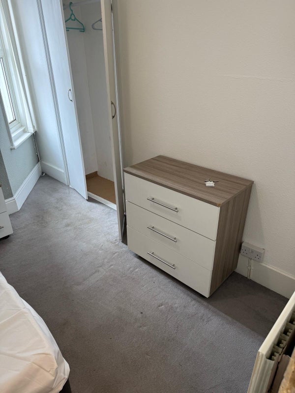 - Fully furnished with bed, mattress, bedside table, chest of drawers and wardrobe