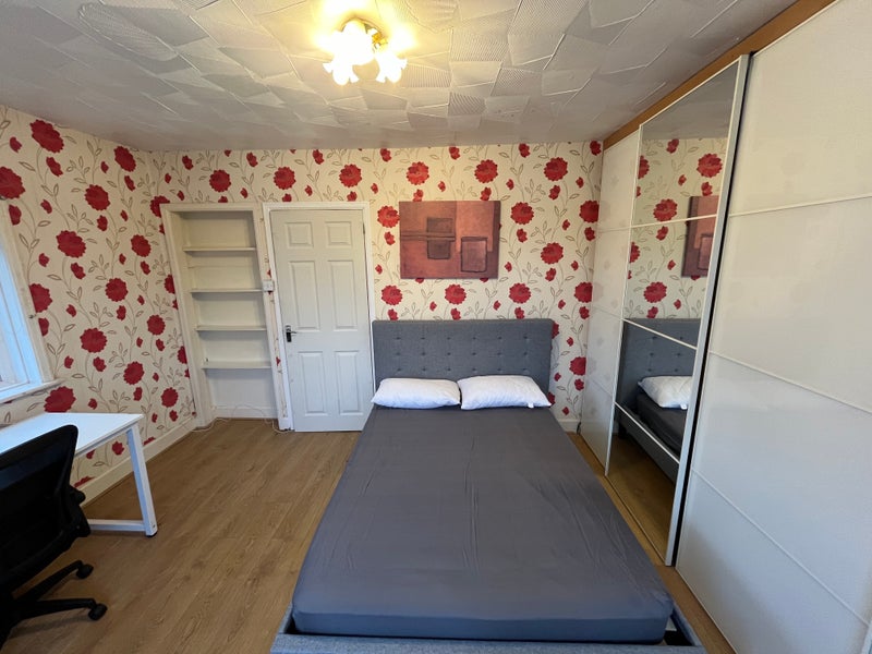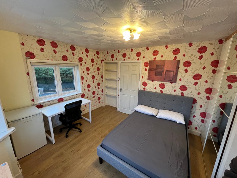 This is an exceptionally large master bedroom, located within a beautiful Victorian house on a very quiet and peaceful road in Merryoak, Southampton. The room is fully furnished with brand new items including a double bed and mattress, a large study table, a comfortable rotating chair, and generous cupboard storage. The space is flooded with natural light from multiple windows. For your convenience, a personal fridge and kettle are provided within the room.