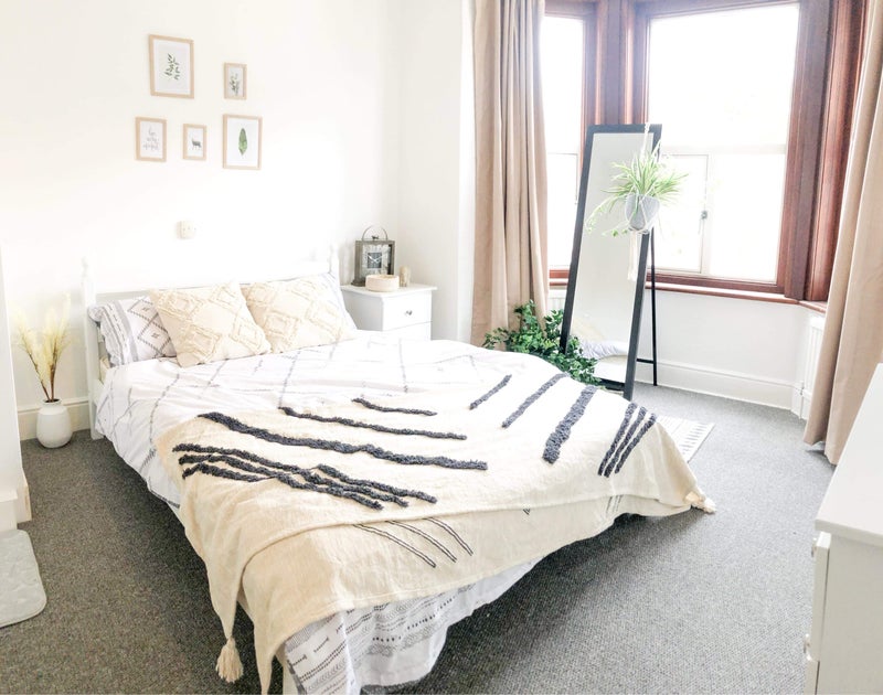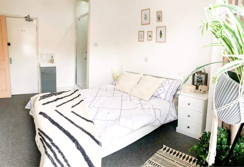 The bedroom has a private shower and a basin. The room is spacious and super cosy. Fitted with black out curtains and comes fully furnished with a double bed and mattress, built in wardrobe, chest of drawers and bedside table. A desk and chair can be provided if required.