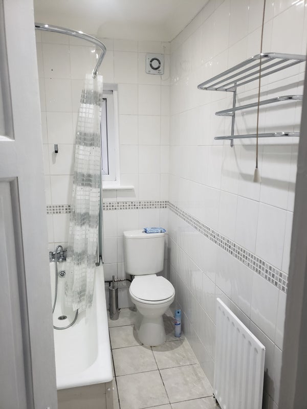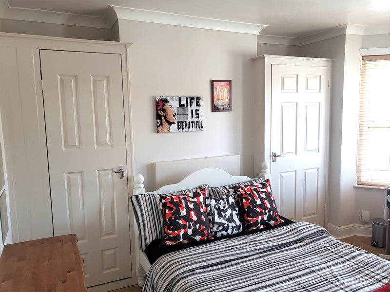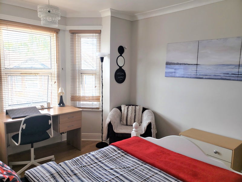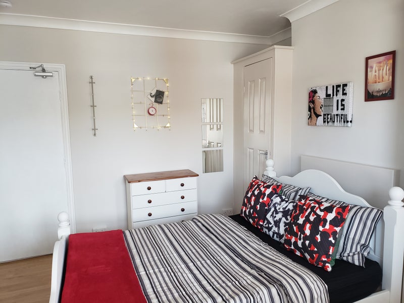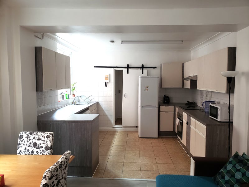 A spacious double room is available from 25th April in this refurbished, fully furnished shared house. The property features a large communal open-plan kitchen/lounge/dining area with plenty of cupboard space, a fully equipped kitchen, a big sofa, a flat-screen TV, and a dining table.