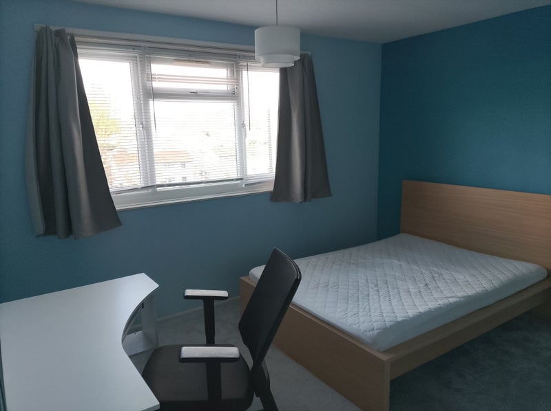 Furnished double room, all bills included. Currently painted blue at request of last tennant but can be changed. Relaxed house with a mix of hobbies and interests. Street parking for cars and concrete pad for bikes with anchors and camera. Current housemate work is healthcare, academia and data.