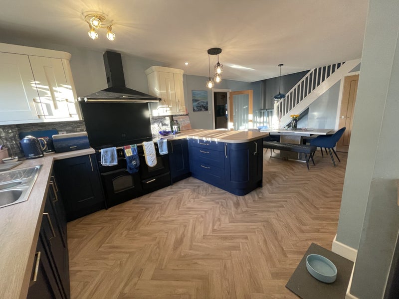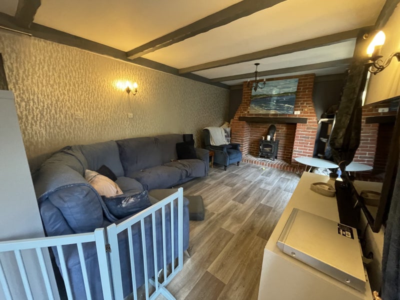 The stunning living room has two seating areas, and a log burner that crackles away merrily in colder months and has such a cosy vibe no matter the season! + A large Tv connected to WiFi!