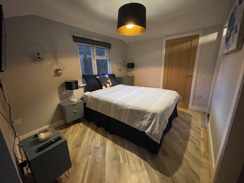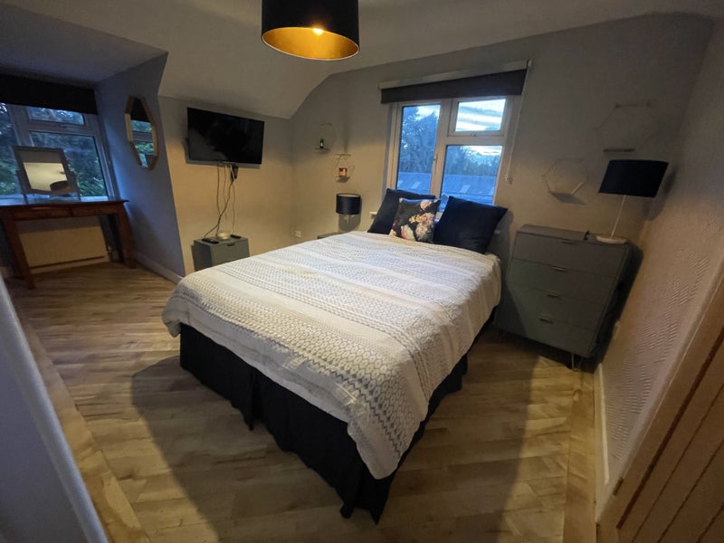 The room is furnished with a super comfy (like a cloud) king size bed & chest of drawers, two bedside tables & dressing table overlooking with a beautiful view of the garden. A Tv on a tilt & move bracket is also included.