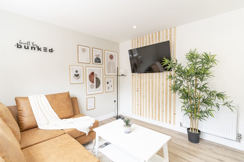 The open-plan kitchen and lounge features sleek appliances, including a dishwasher, making entertaining and daily living effortless. Relax in the spacious lounge with a large flat-screen TV and comfortable seating—ideal for unwinding after work.