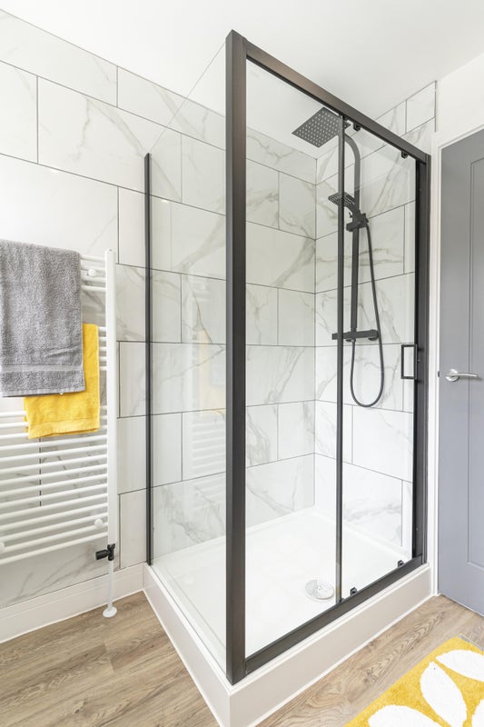 The ground-floor master bedroom boasts a private en-suite with a rainfall shower and elegant marble finishes. Three additional bedrooms share a stylish, modern shower room upstairs.