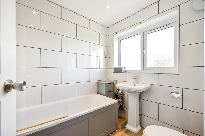 There are two bathrooms: one with a bath and shower over, and a second modern, stylish shower room.