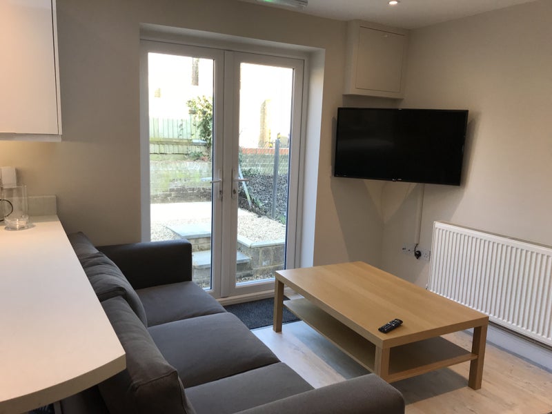 Professional double rooms to rent with modern shared kitchen and living space with patio doors leading to a courtyard garden.
