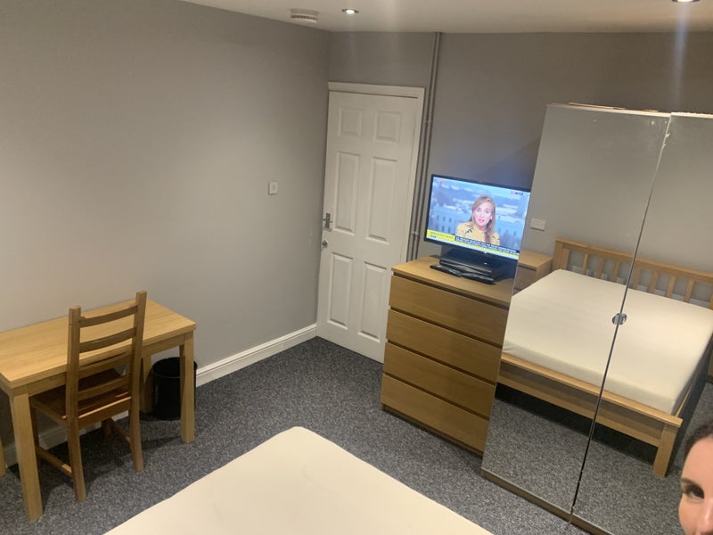 Double Bed, 2 x bedsides, chest of draws, 4 door mirrored wardrobe, dining table with chairs, your own microwave and kettle, flat screen and free view sat box, WiFi, all bills included , no hidden extras or charges.