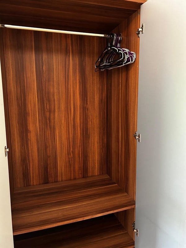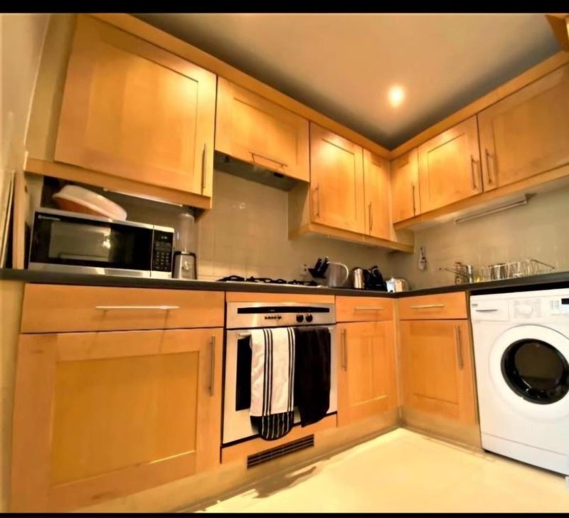 The room includes all essential furniture and access to a washing machine, microwave, oven, and gas cooker.