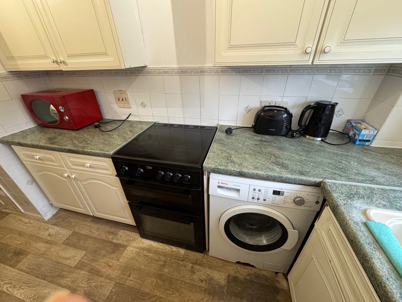 Fully furnished, kitchen with oven, hob, microwave, kettle, iron, fridge-freezer, plats, pots and pans etc. all included.