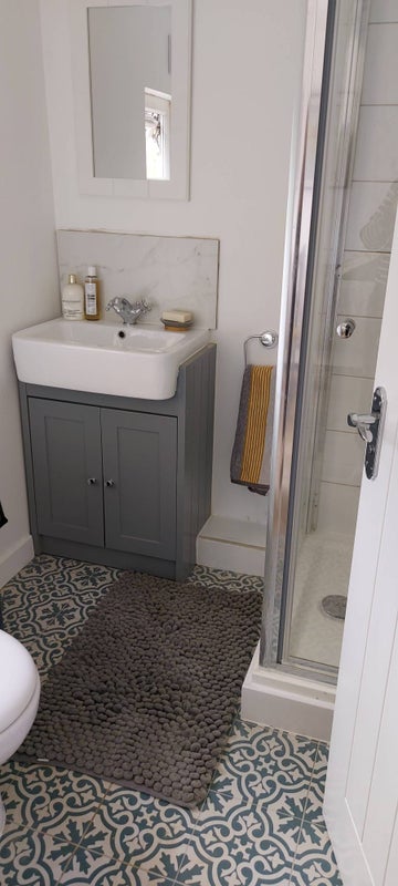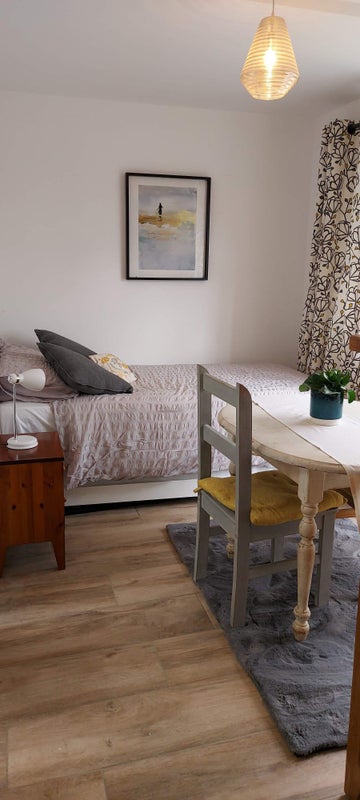 This is a recently built exstension room with a brand new ensuite bathroom. This downstairs room also has a separate access door. It overlooks the garden and pond. But has no access to the garden. There is a small shared utility room with a microwave and a few cupboards. Suitable for heating meals.