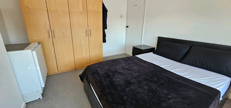 Wardrobes and bedside cabinets, fridge, double bed , door with lock.