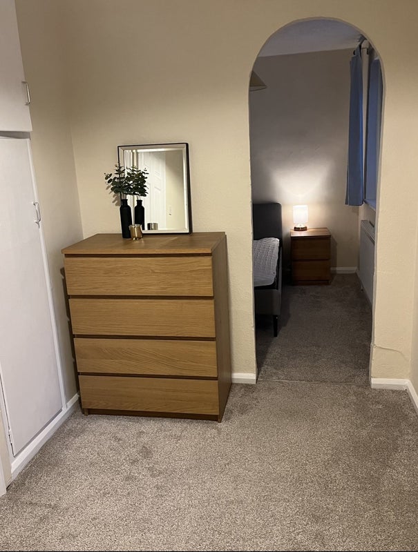 Double bedrooms are fully furnished with a vanity sink, bed, bedside table, wardrobe, desk, chair & drawers.