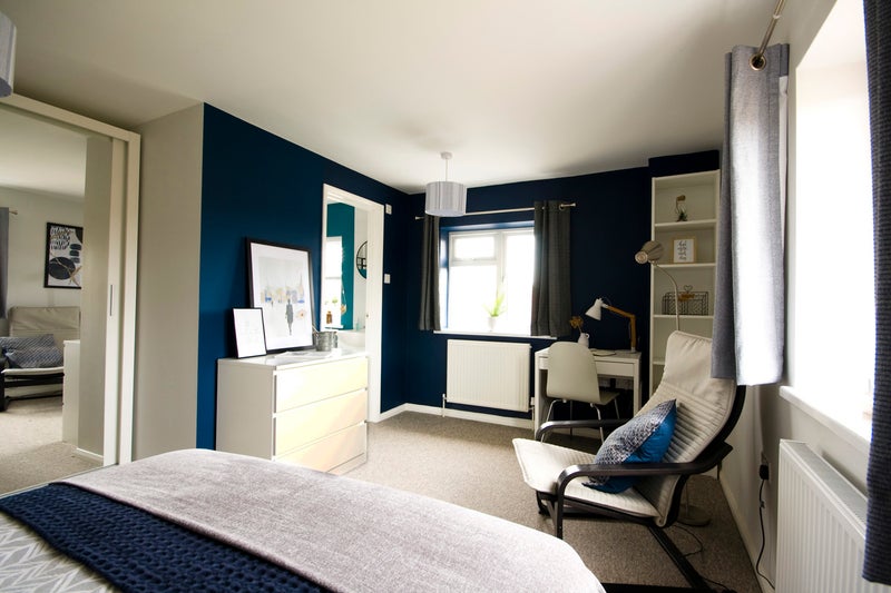 This large, luxury double room with dedicated bathroom is decorated to a high standard, fully furnished with a bed, wardrobe, bookcase, desk and space for more.