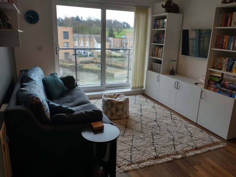 A furnished room with it's own bathroom in a quiet two bedroom flat. Shared kitchen and living room. Small double bed. Lots of storage space. Lovely view from the balcony.