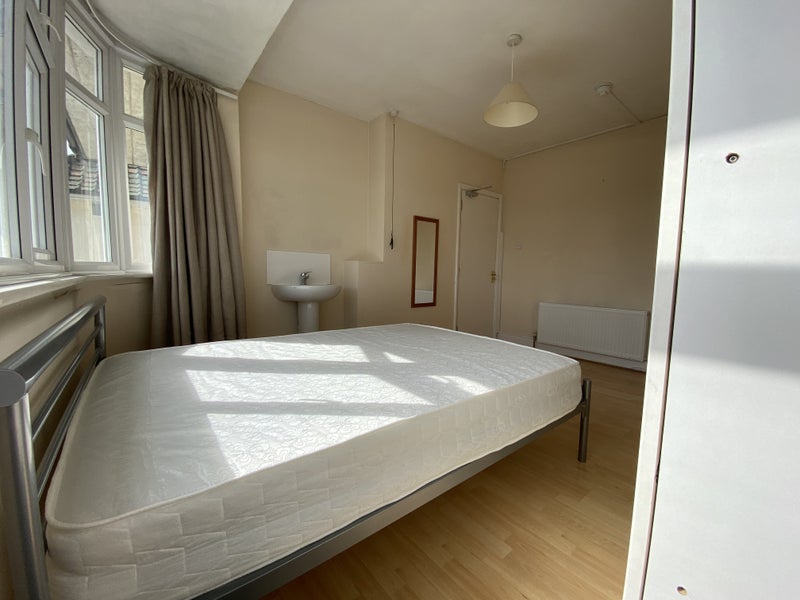 This is a large, bright room on the first floor with fantastic views. It has loads of wardrobe space, a chest of drawers, double bed and mattress and even a fridge. There is also a hand basin in the room.