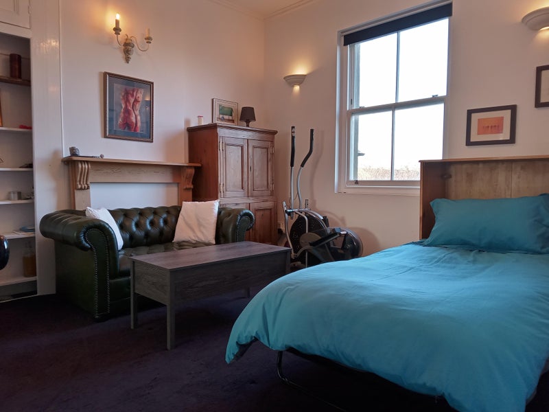 A spacious, bright, and comfortable bedroom, fully furnished with a large double bed, a sofa, a desk, and a walk-in wardrobe offering plenty of storage. Large sash windows make the room feel light and airy.