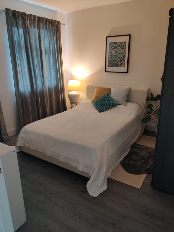 A cosy room with a double bed and access to the kitchen, large bathroom, toilet, living room, and patio perfect for relaxing.