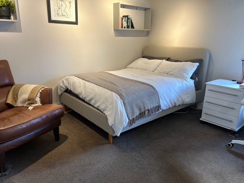 room with a small ensuite and has just been redecorated .