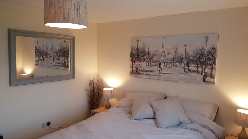 Comfortable double room available in a modern four-bedroom house in Takeley. The room is fully furnished with a wardrobe, chest of drawers, bedside drawers, large mirror and a TV suitable for streaming from your laptop.