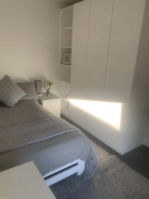The large double room has a desk and lots of storage.