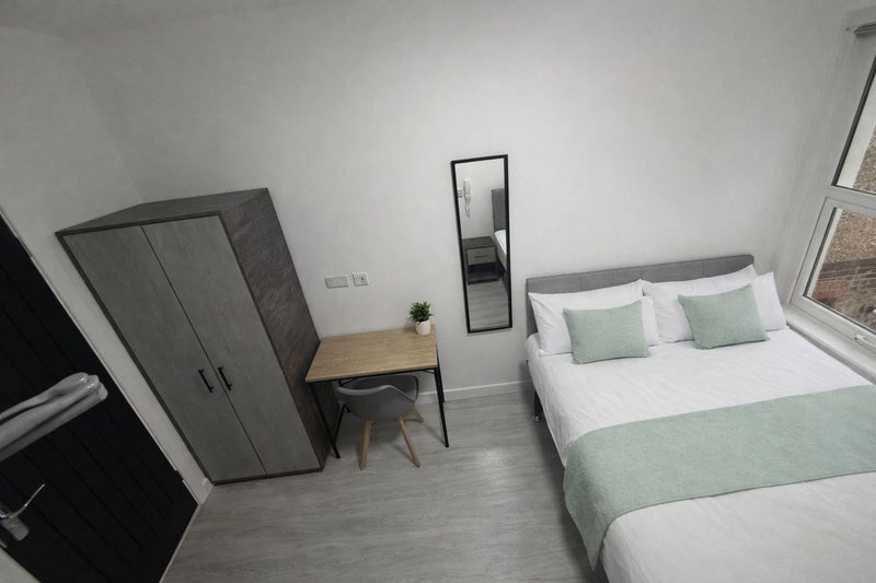 Step into this bright and inviting room featuring a double bed with orthopaedic mattress with a stylish grey upholstered headboard, ensuring a restful night's sleep. The large windows floods the room with natural light.