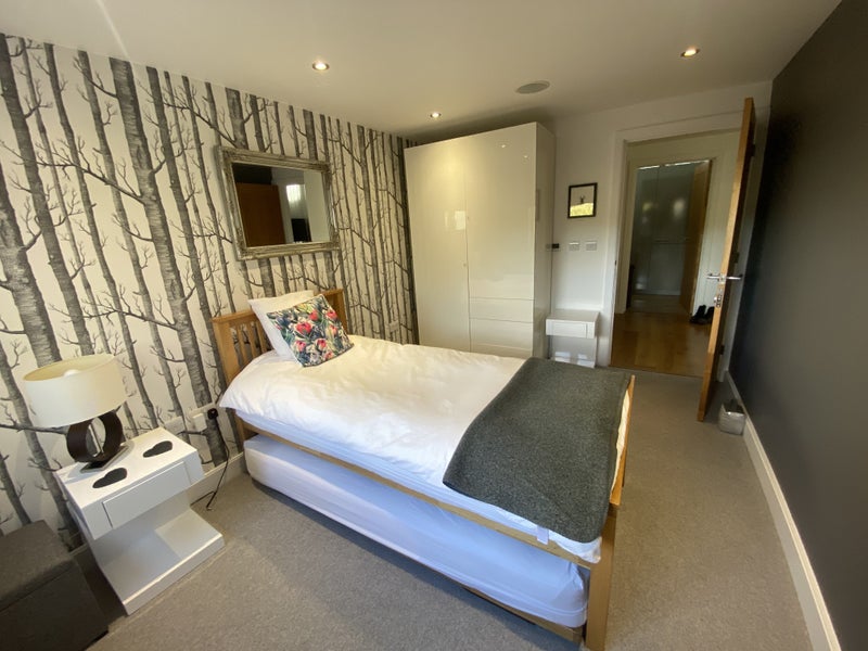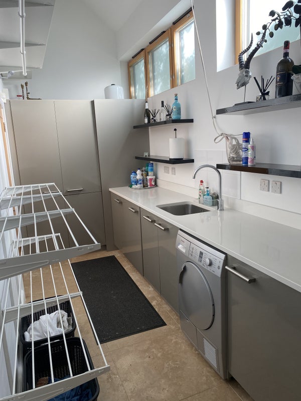 We are offering a lovely furnished ground floor bedroom (shown with single bed but happy to replace with double) with an en-suite with shower. There will be access to a fully equipped laundry room with a washing machine & tumble dryer (see pics). You will have access to a separate fridge and fridge/freezer. The whole property is professionally cleaned every two weeks and a gardener visits weekly. Superfast Broadband is included.