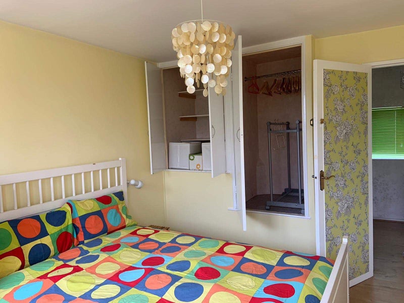 The bedroom benefits of plenty of storage, a working desktop and a double bed .