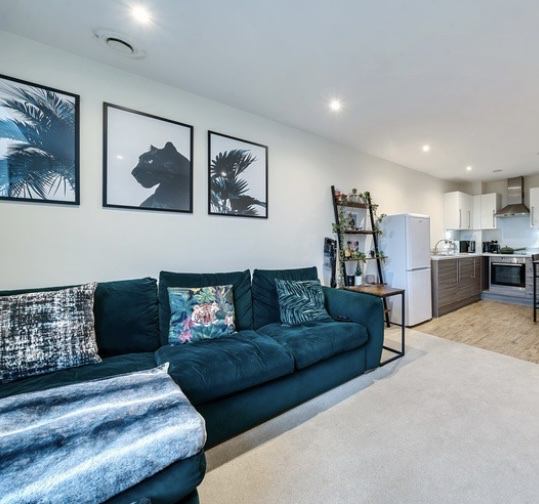 A spacious lounge with 55" TV with a Roku with a green sofa bed. Space for a desk. If you’d like to have live tv there is a Sky Q box but TV license would need to be paid (can send additional payment and will arrange).