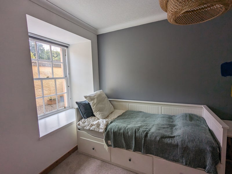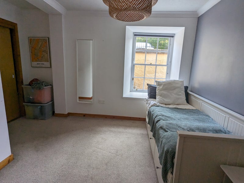 The bedroom available has built in storage and tall drawer unit but the desk is no longer in the room. The day bed is currently set up as a single but can be set up as a double. I am offering it part furnished for flexibility and that you can make it feel your own space.