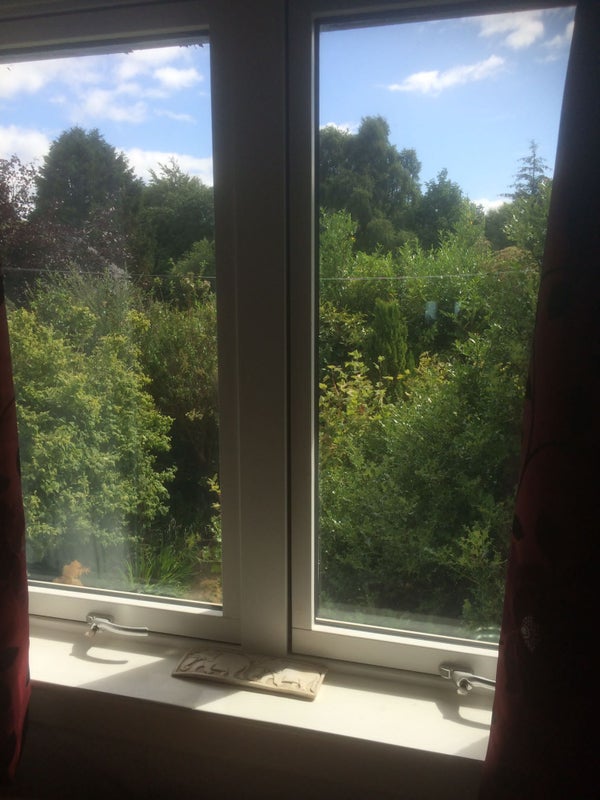 Comfortable small Single room in village location with armchair, wardrobe, chest of drawers, folding table and bedside cabinet with bedside lamp. Window looking out onto the garden below.