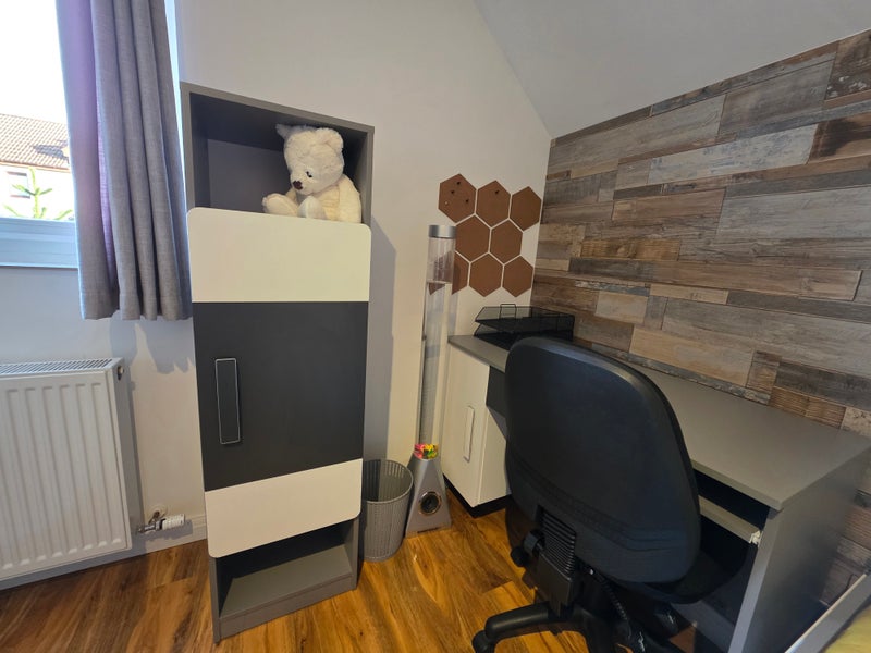 Wardrobe, desk, chair, and notice board.