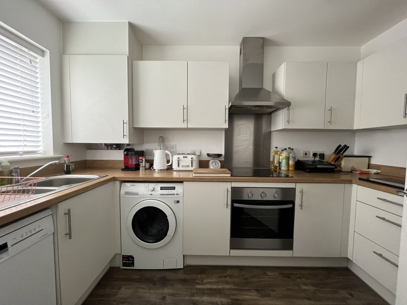 Shared modern kitchen with fridge/freezer, washing machine, toaster, dishwasher, grill, oven and hob.